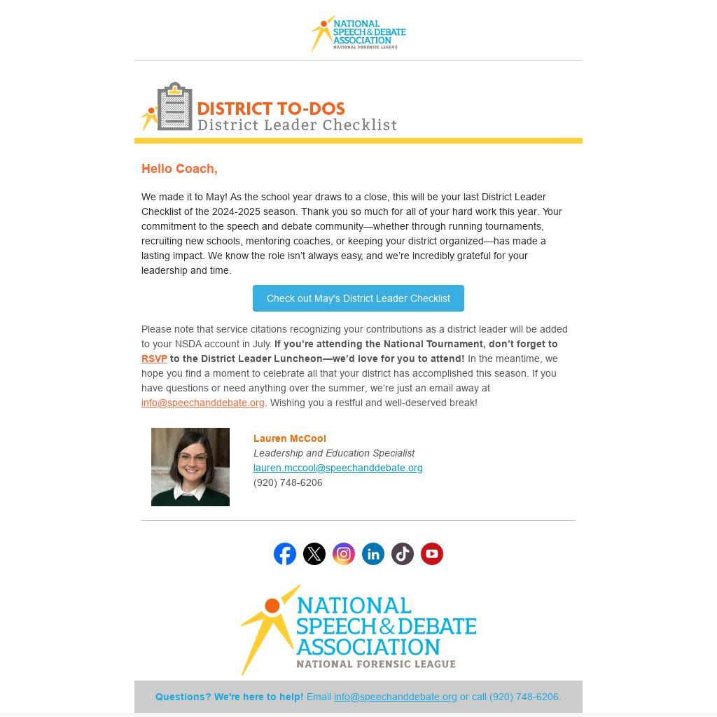We made it to May! As the school year draws to a close, this will be your last District Leader Checklist of the 2024-2025 season. Thank you so much for all of your hard work this year. Your commitment to the speech and debate community—whether through running tournaments, recruiting new schools, mentoring coaches, or keeping your district organized—has made a lasting impact. We know the role isn’t always easy, and we’re incredibly grateful for your leadership and time.