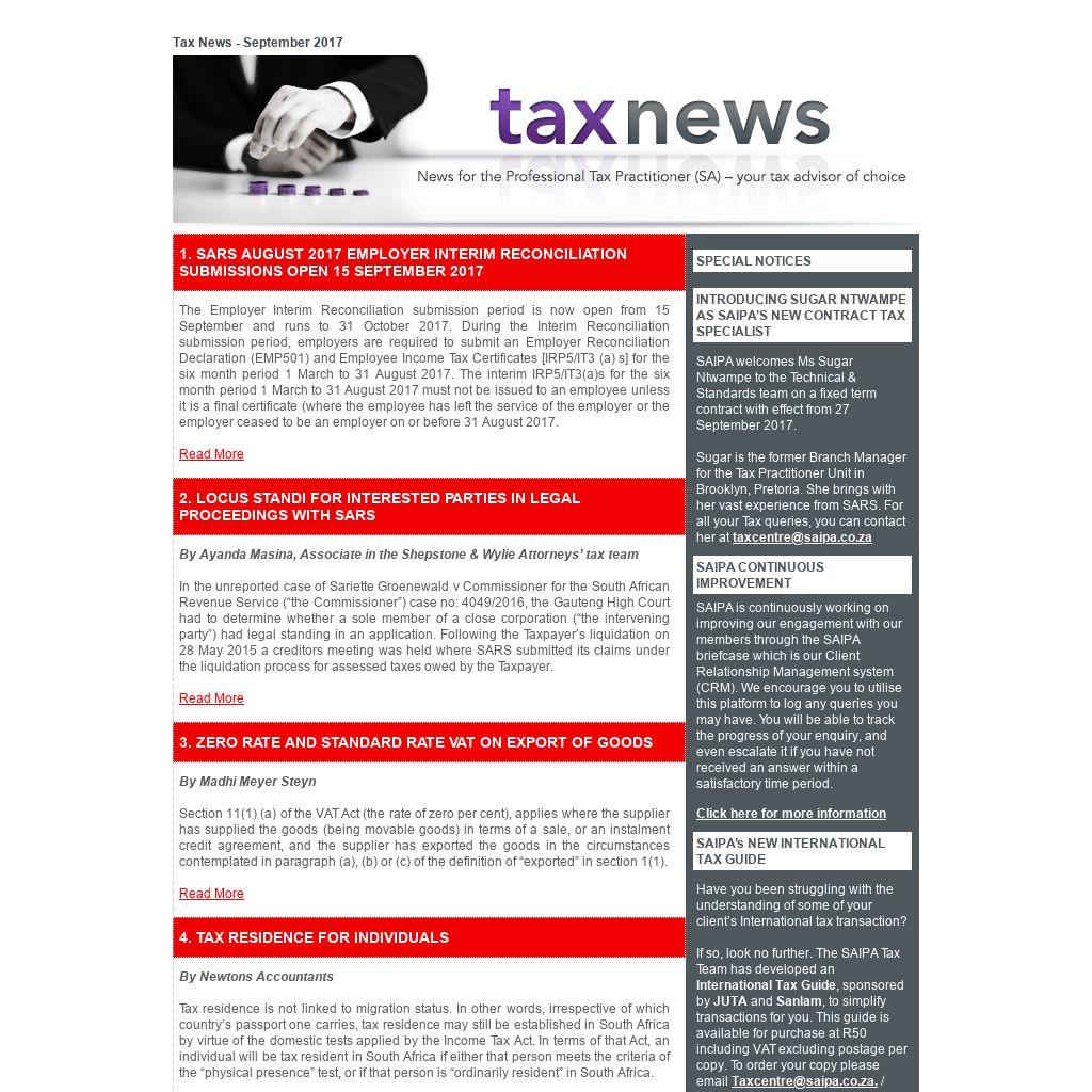 | 1. SARS August 2017 Employer Interim Reconciliation submissions open 15 September 2017 | | The Employer Interim Reconciliation submission period is now open from 15 September and runs to 31 October 2017. During the Interim Reconciliation submission period, employers are required to submit an Employer Reconciliation Declaration (EMP501) and Employee Income Tax Certificates [IRP5/IT3 (a) s] for the six month period 1 March to 31 August 2017. The interim IRP5/IT3(a)s for the six month period 1 March to 31 August 2017 must not be issued to an employee unless it is a final certificate (where the employee has left the service of the employer or the employer ceased to be an employer on or before 31 August 2017. | | Read More | | 2. Locus Standi for interested parties in legal proceedings with SARS | By Ayanda Masina, Associate in the Shepstone & Wylie Attorneys’ tax team