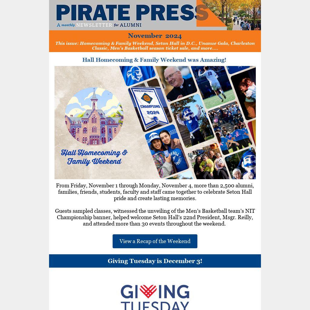 This issue: Homecoming & Family Weekend, Seton Hall in D.C., Unanue Gala, Charleston Classic, Men's Basketball season ticket sale, and more.... |