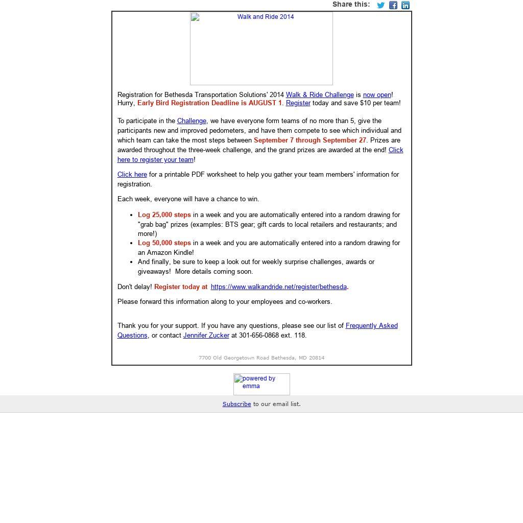 To participate in the Challenge, we have everyone form teams of no more than 5, give the participants new and improved pedometers, and have them compete to see which individual and which team can take the most steps between September 7 through September 27. Prizes are awarded throughout the three-week challenge, and the grand prizes are awarded at the end! Click here to register your team!