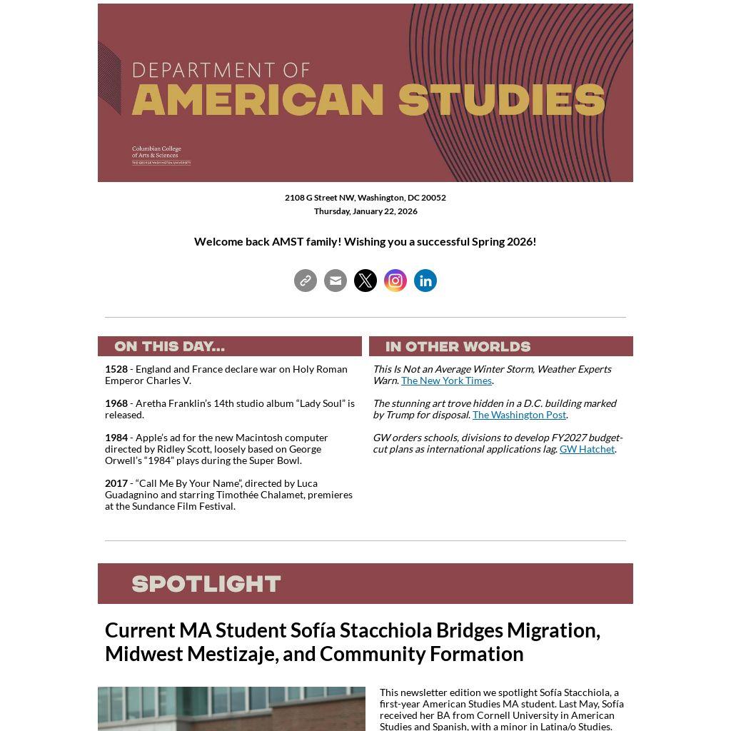 Like what you see? Have spotlights, kudos, events, or opportunities that you would like to share? We want to hear from you! Navigate to our feedback form using the link below, or more simply, forward your tip to amst@gwu.edu.