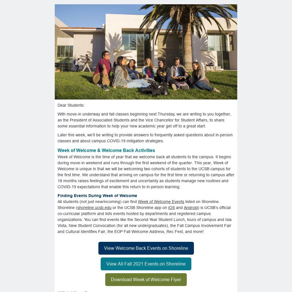 With move-in underway and fall classes beginning next Thursday, we are writing to you together, as the President of Associated Students and the Vice Chancellor for Student Affairs, to share some essential information to help your new academic year get off to a great start.