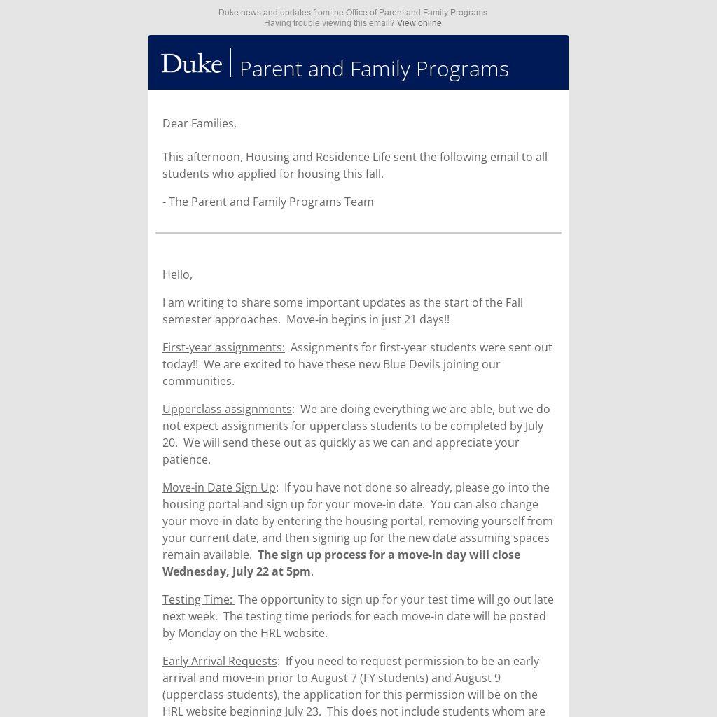 First-year assignments: Assignments for first-year students were sent out today!! We are excited to have these new Blue Devils joining our communities.