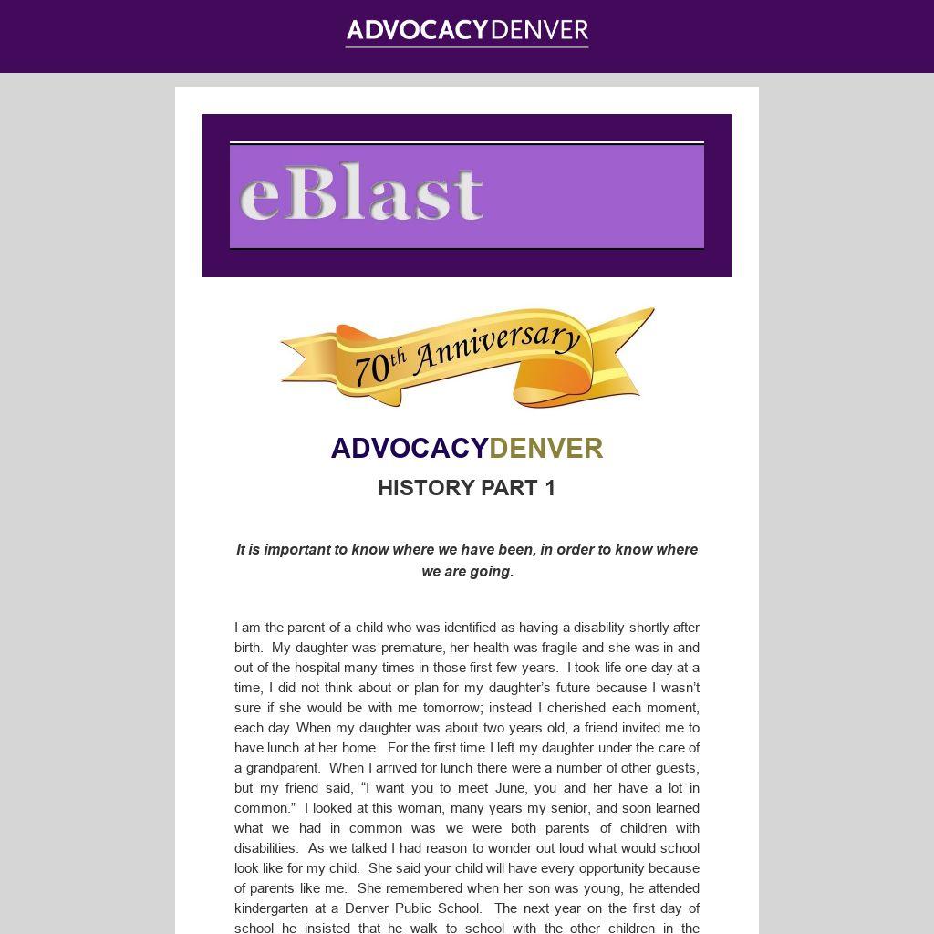 This year AdvocacyDenver will celebrate its 70th anniversary. Over the next year we will share the history of our organization and the disability community. It is important that we take the time to honor the parents, families, self-advocates and providers who stood firm demanding the human rights of individuals with disabilities.
