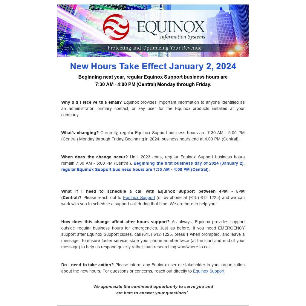 When does the change occur? Until 2023 ends, regular Equinox Support business hours remain 7:30 AM - 5:00 PM (Central). Beginning the first business day of 2024 (January 2), regular Equinox Support business hours are 7:30 AM - 4:00 PM (Central).