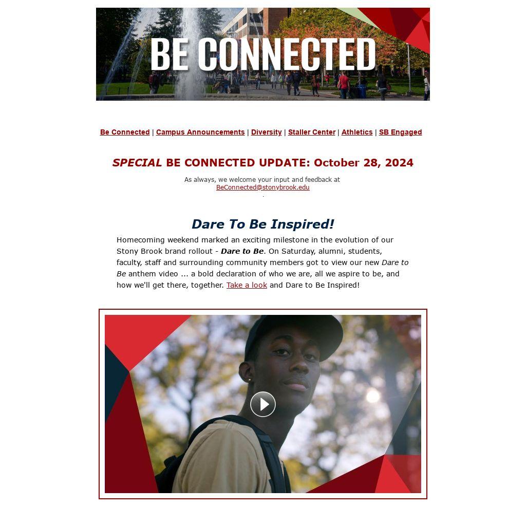 Homecoming weekend marked an exciting milestone in the evolution of our Stony Brook brand rollout - Dare to Be. On Saturday, alumni, students, faculty, staff and surrounding community members got to view our new Dare to Be anthem video ... a bold declaration of who we are, all we aspire to be, and how we'll get there, together. Take a look and Dare to Be Inspired!