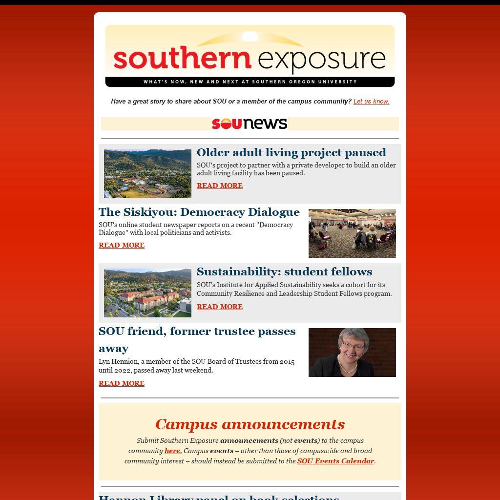 Submit Southern Exposure announcements (not events) to the campus community here. Campus events – other than those of campuswide and broad community interest – should instead be submitted to the SOU Events Calendar.