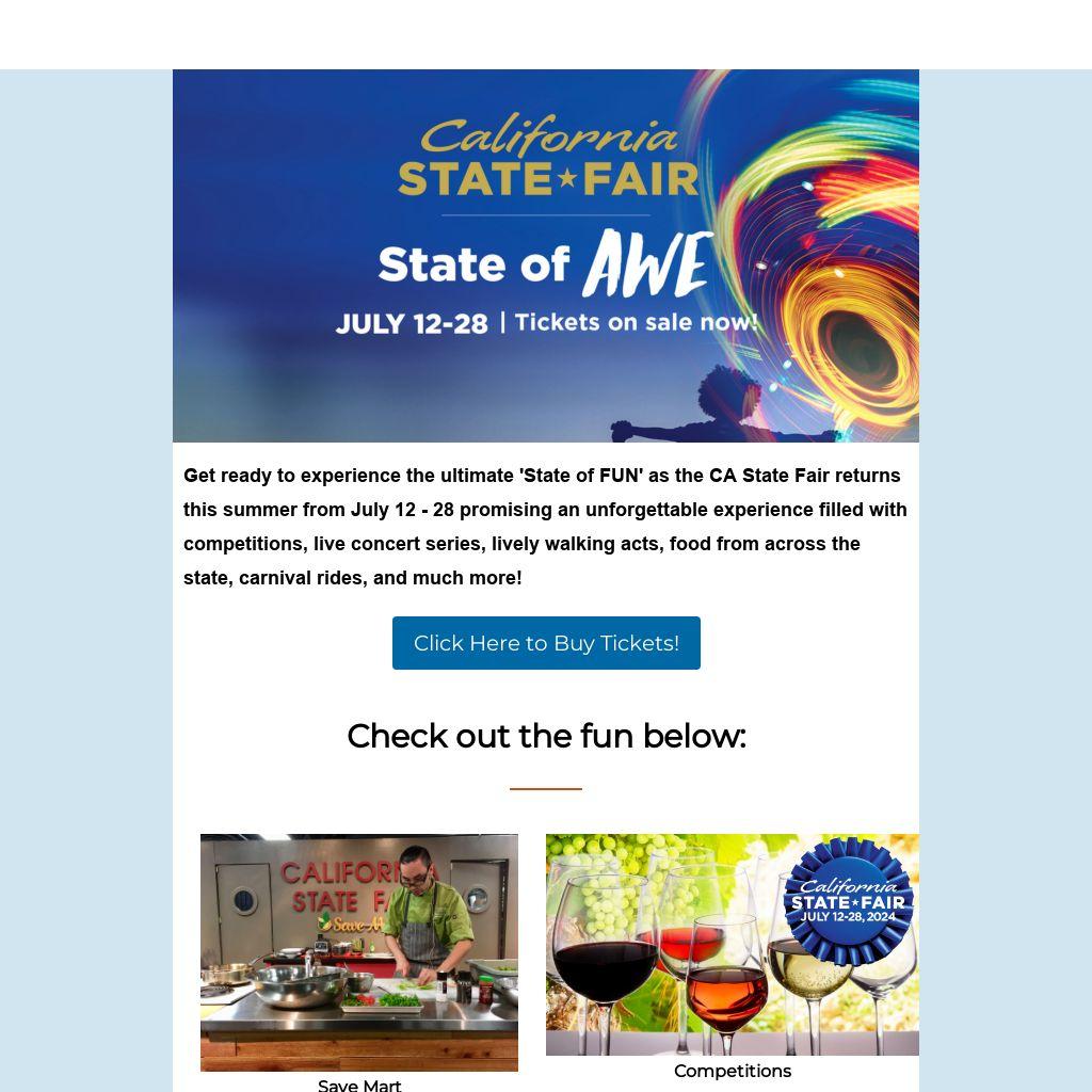 Get ready to experience the ultimate 'State of FUN' as the CA State Fair returns this summer from July 12 - 28 promising an unforgettable experience filled with competitions, live concert series, lively walking acts, food from across the state, carnival rides, and much more!