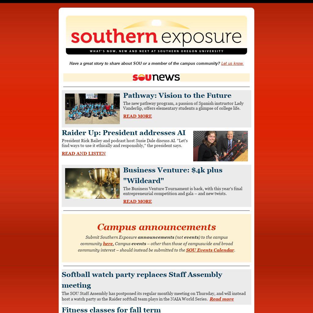 Submit Southern Exposure announcements (not events) to the campus community here. Campus events – other than those of campuswide and broad community interest – should instead be submitted to the SOU Events Calendar.