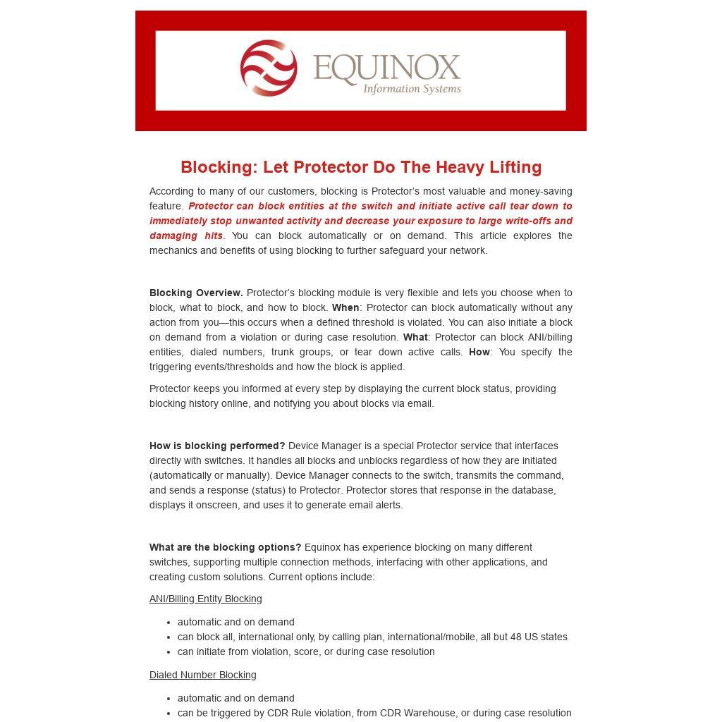 Can I add blocking now? Yes. We can add blocking to your installation, even after implementation is complete. The process involves specifying your desired blocking logic, providing switch connection and login credentials, submitting test numbers, and confirming successful blocking. The Protector Blocking Bulletin outlines a typical blocking project, and Equinox Support works with you through every step of the process.