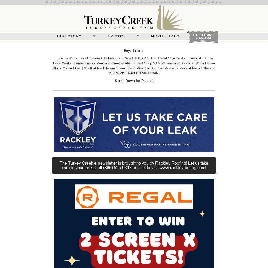 Enter to Win a Pair of ScreenX Tickets from Regal! TODAY ONLY, Travel Size Product Deals at Bath & Body Works! Hunter Ensley Meet and Greet at Alumni Hall! Shop 50% off Tees and Shorts at White House Black Market! Get $10 off at Rack Room Shoes! Don't Miss the Summer Movie Express at Regal! Shop up to 50% off Select Brands at Belk!