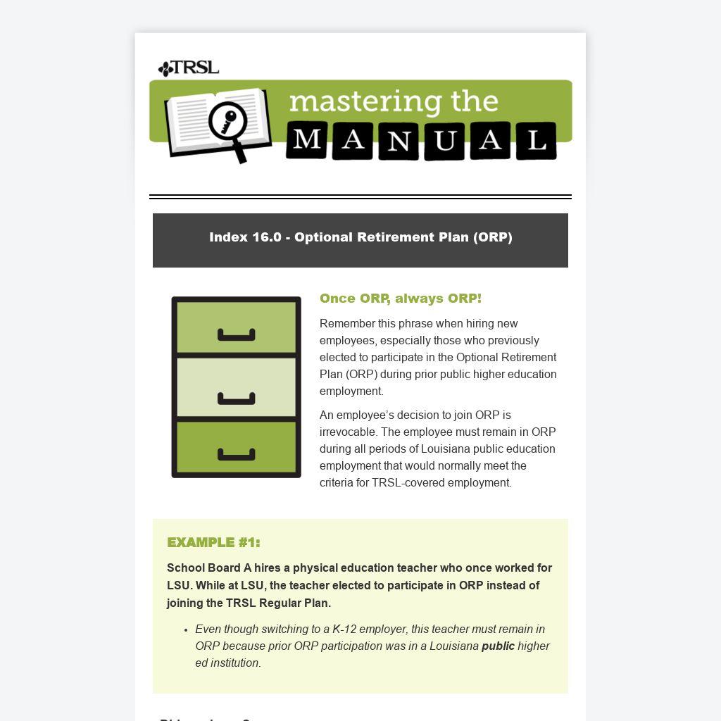 - Because ORP participants can never rejoin the TRSL Regular Plan, a non-vested member (less than five years of service credit) will never accrue enough service credit to earn a benefit from the Regular Plan.
