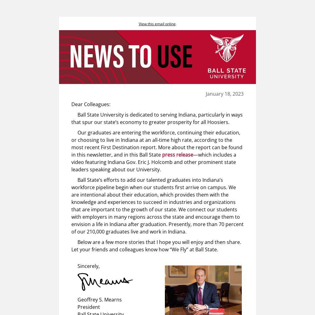 Our graduates are entering the workforce, continuing their education, or choosing to live in Indiana at an all-time high rate, according to the most recent First Destination report. More about the report can be found in this newsletter, and in this Ball State press release—which includes a video featuring Indiana Gov. Eric J. Holcomb and other prominent state leaders speaking about our University.