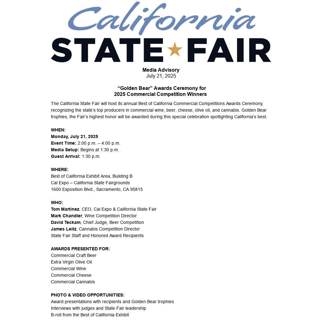 The California State Fair will host its annual Best of California Commercial Competitions Awards Ceremony, recognizing the state’s top producers in commercial wine, beer, cheese, olive oil, and cannabis. Golden Bear trophies, the Fair’s highest honor will be awarded during this special celebration spotlighting California’s best.