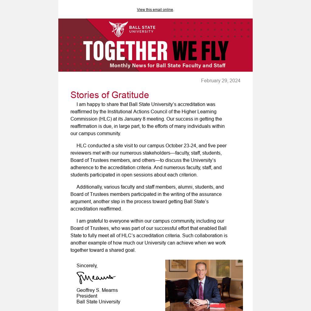 I am grateful to everyone within our campus community, including our Board of Trustees, who was part of our successful effort that enabled Ball State to fully meet all of HLC’s accreditation criteria. Such collaboration is another example of how much our University can achieve when we work together toward a shared goal.