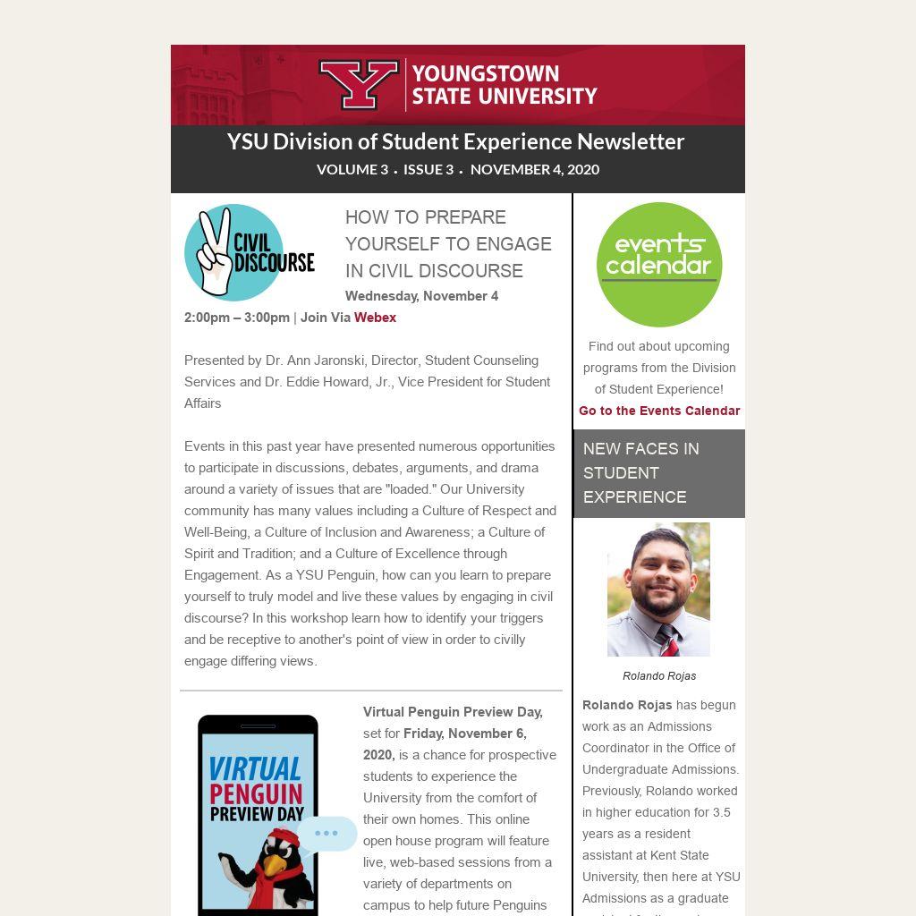Presented by Dr. Ann Jaronski, Director, Student Counseling Services and Dr. Eddie Howard, Jr., Vice President for Student Affairs Events in this past year have presented numerous opportunities to participate in discussions, debates, arguments, and drama around a variety of issues that are "loaded." Our University community has many values including a Culture of Respect and Well-Being, a Culture of Inclusion and Awareness; a Culture of Spirit and Tradition; and a Culture of Excellence through Engagement. As a YSU Penguin, how can you learn to prepare yourself to truly model and live these values by engaging in civil discourse? In this workshop learn how to identify your triggers and be receptive to another's point of view in order to civilly engage differing views.