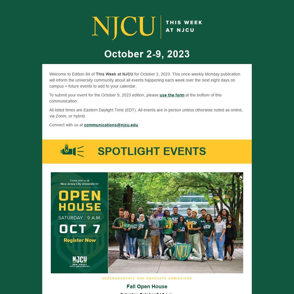Welcome to Edition 84 of This Week at NJCU for October 2, 2023. This once-weekly Monday publication will inform the university community about all events happening each week over the next eight days on campus + future events to add to your calendar.