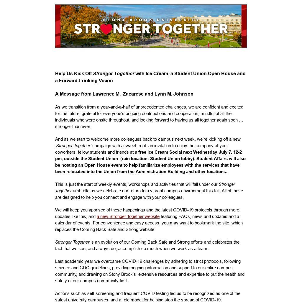 In short, we are fully prepared and excited for fall and hope that you are too. Together we must continue to do all that we can to uphold our standards of academic excellence and to provide the rich and meaningful experiences that are the hallmarks of life at Stony Brook University. We will celebrate the return of a bustling campus. And we are proud of this community and all that you have accomplished during this most difficult time. We know that we will always be #StrongerTogether.