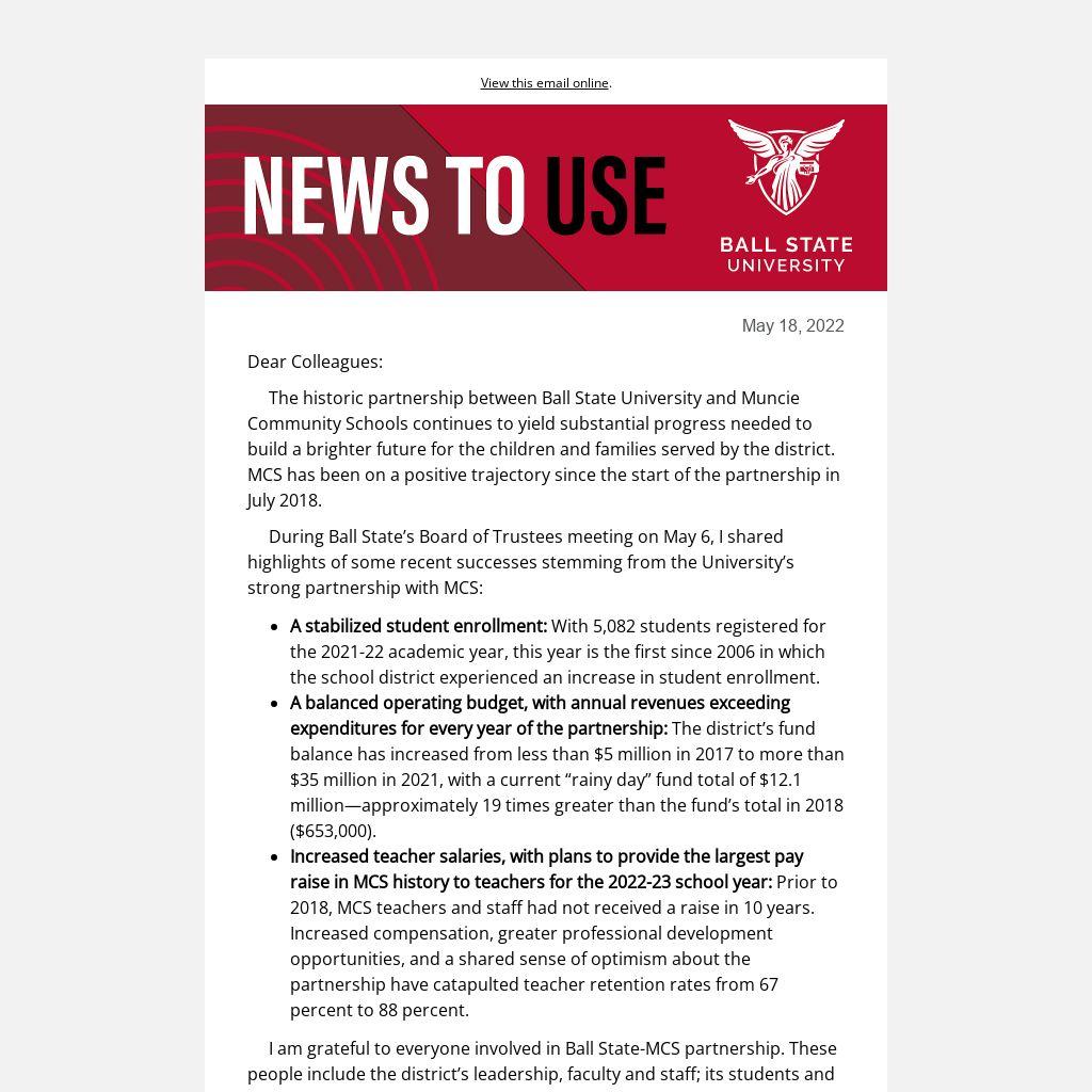 During Ball State’s Board of Trustees meeting on May 6, I shared highlights of some recent successes stemming from the University’s strong partnership with MCS: