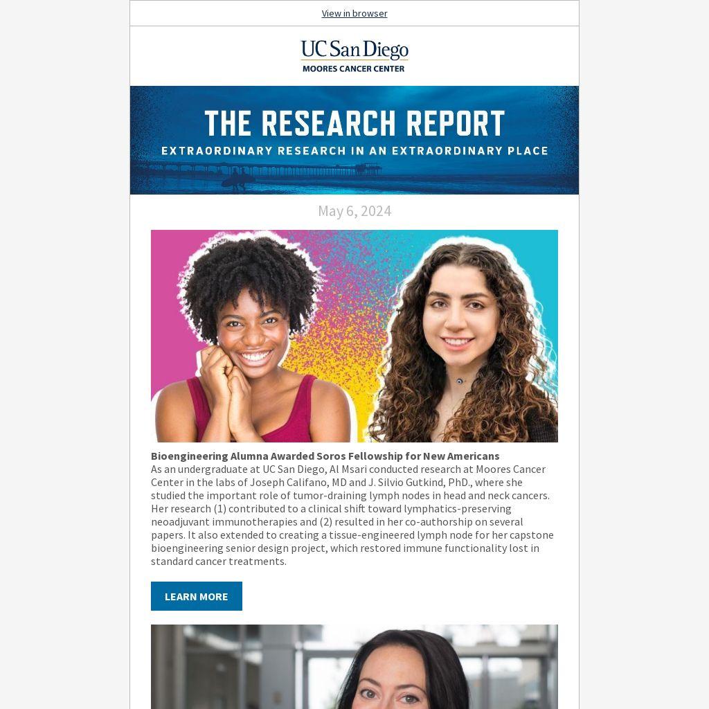 As an undergraduate at UC San Diego, Al Msari conducted research at Moores Cancer Center in the labs of Joseph Califano, MD and J. Silvio Gutkind, PhD., where she studied the important role of tumor-draining lymph nodes in head and neck cancers. Her research (1) contributed to a clinical shift toward lymphatics-preserving neoadjuvant immunotherapies and (2) resulted in her co-authorship on several papers. It also extended to creating a tissue-engineered lymph node for her capstone bioengineering senior design project, which restored immune functionality lost in standard cancer treatments.