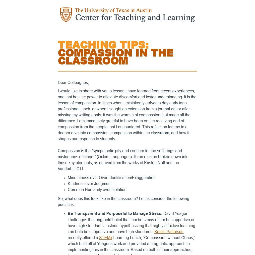 - “Self-compassionate Teaching: Putting on your Oxygen Mask First,” an insightful piece by Julaine Fowlin, Becca Sandhu, and Samantha York (Vanderbilt University).