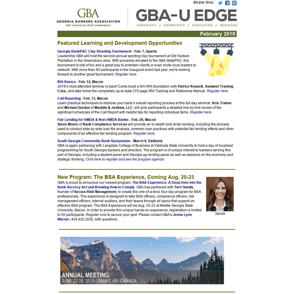 New Program: The BSA Experience, Coming Aug. 20-23GBA is proud to announce our newest program, The BSA Experience: A Deep Dive into the Bank Secrecy Act and Knowing How to Comply. GBA has partnered with Terri Sands, founder of Secura Risk Management, to create this one-of-a-kind, four-day program for BSA professionals. This experience is designed to take BSA officers, compliance officers, risk management officers, internal auditors, and their teams through all topics that support an effective BSA program. The BSA Experience will be Aug. 20-23 at Middle Georgia State University, Macon. In order to provide this unique hands-on experience, registration is limited to 50 participants. Register now to secure your spot. Please contact GBA’s Jenna Lynn Warner, 404.420.2035, with questions.