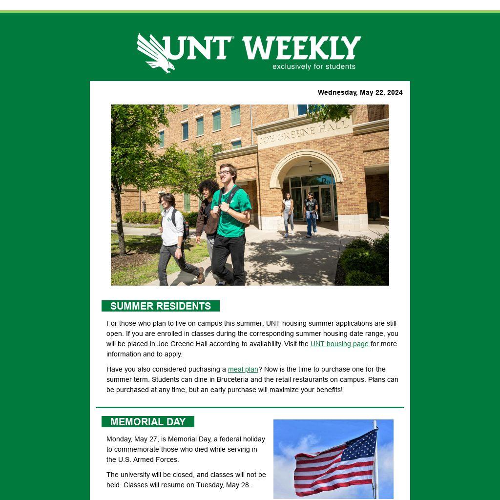 For those who plan to live on campus this summer, UNT housing summer applications are still open. If you are enrolled in classes during the corresponding summer housing date range, you will be placed in Joe Greene Hall according to availability. Visit the UNT housing page for more information and to apply.