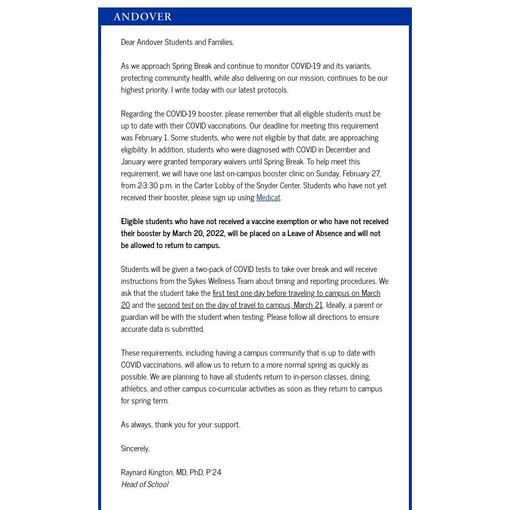 Dear Andover Students and Families,