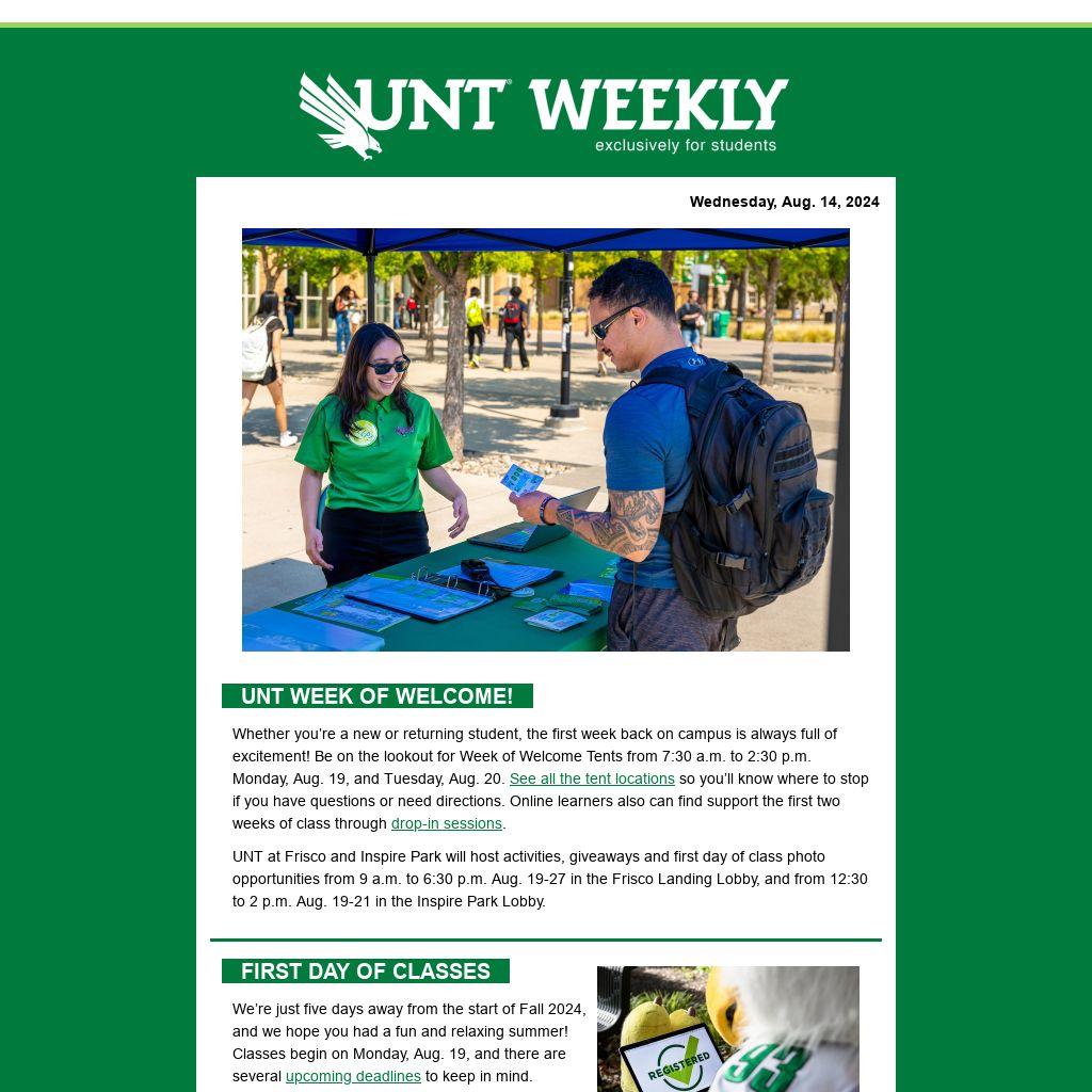 UNT at Frisco and Inspire Park will host activities, giveaways and first day of class photo opportunities from 9 a.m. to 6:30 p.m. Aug. 19-27 in the Frisco Landing Lobby, and from 12:30 to 2 p.m. Aug. 19-21 in the Inspire Park Lobby.
