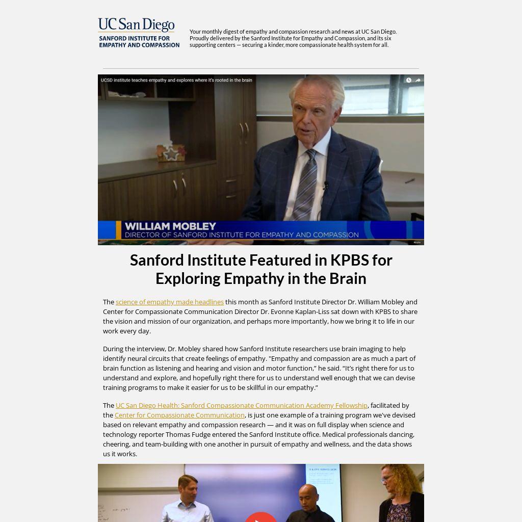 Your monthly digest of empathy and compassion research and news at UC San Diego. Proudly delivered by the Sanford Institute for Empathy and Compassion, and its six supporting centers — securing a kinder, more compassionate health system for all.