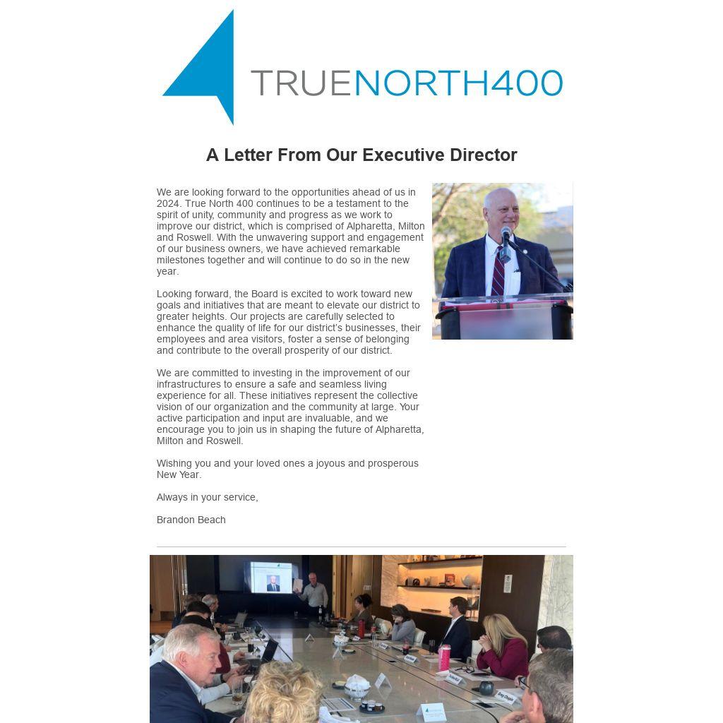 We are looking forward to the opportunities ahead of us in 2024. True North 400 continues to be a testament to the spirit of unity, community and progress as we work to improve our district, which is comprised of Alpharetta, Milton and Roswell. With the unwavering support and engagement of our business owners, we have achieved remarkable milestones together and will continue to do so in the new year.