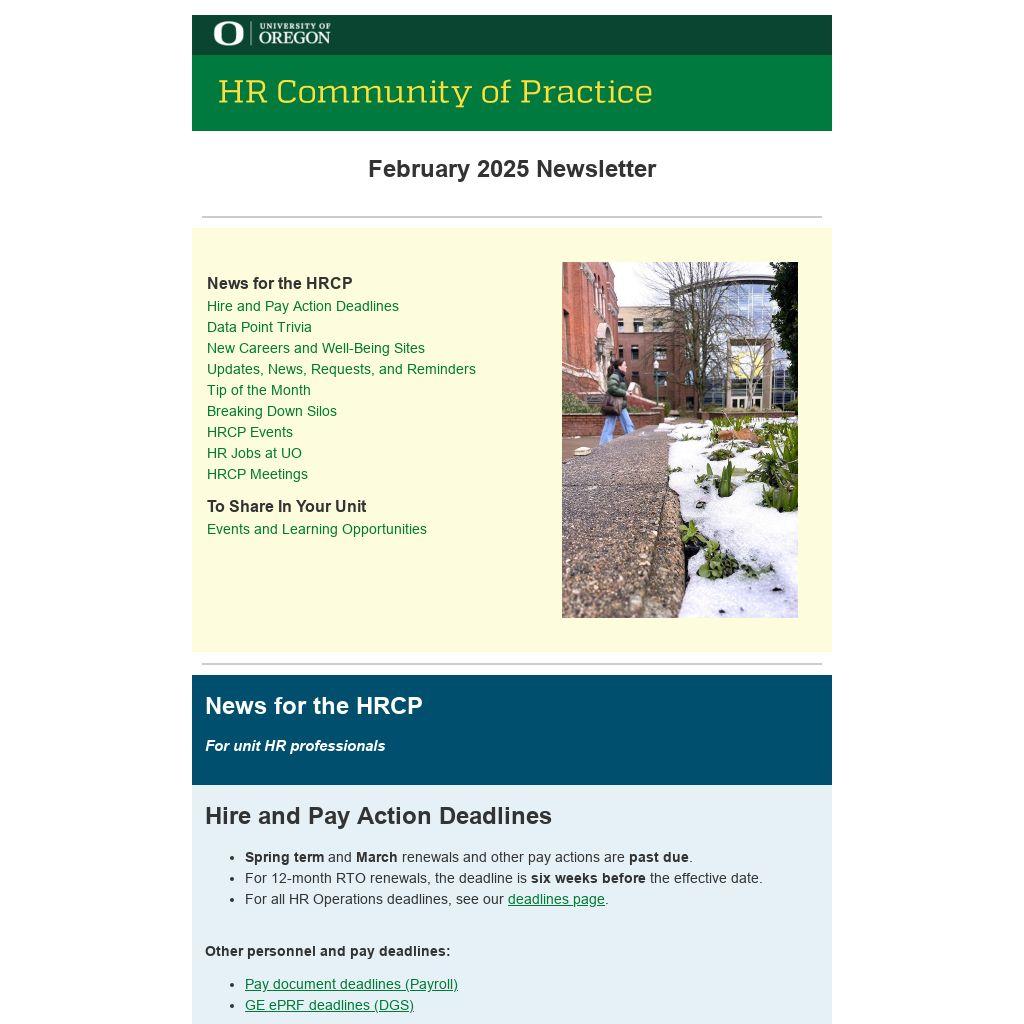 Events designed for or of interest to the UO HR community. There's a lot to share this month—make sure to bookmark the HR Community of Practice calendar or add it to your Outlook to keep up with everything!