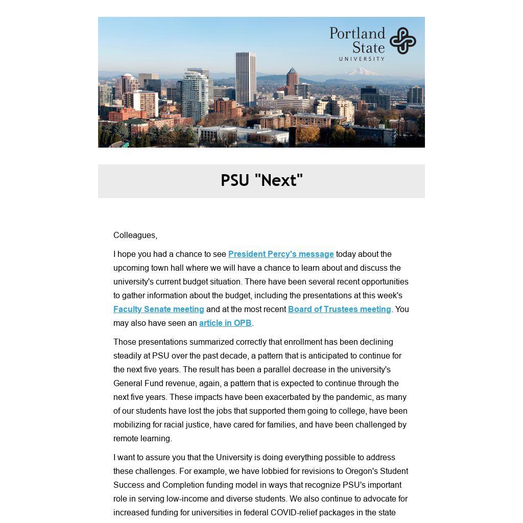 I hope you had a chance to see President Percy's message today about the upcoming town hall where we will have a chance to learn about and discuss the university's current budget situation. There have been several recent opportunities to gather information about the budget, including the presentations at this week's Faculty Senate meeting and at the most recent Board of Trustees meeting. You may also have seen an article in OPB.