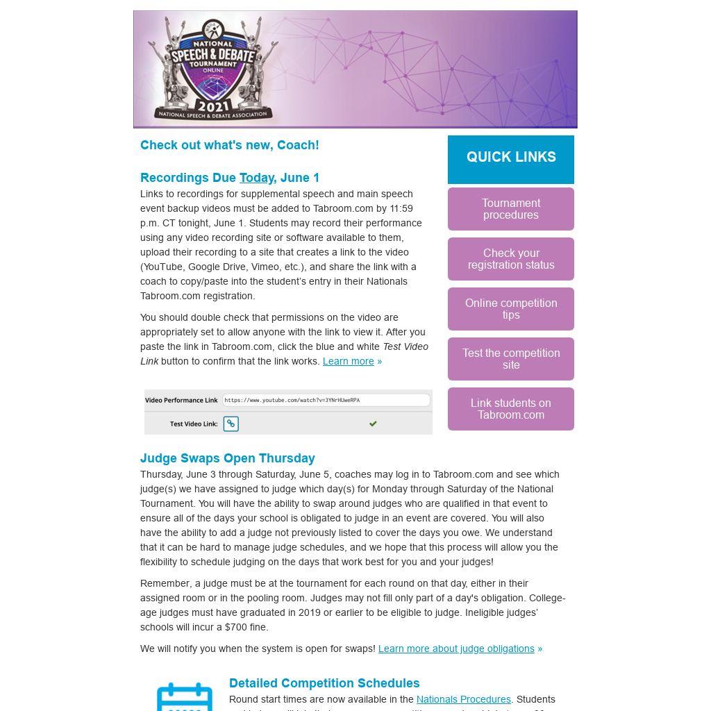 Links to recordings for supplemental speech and main speech event backup videos must be added to Tabroom.com by 11:59 p.m. CT tonight, June 1. Students may record their performance using any video recording site or software available to them, upload their recording to a site that creates a link to the video (YouTube, Google Drive, Vimeo, etc.), and share the link with a coach to copy/paste into the student’s entry in their Nationals Tabroom.com registration.