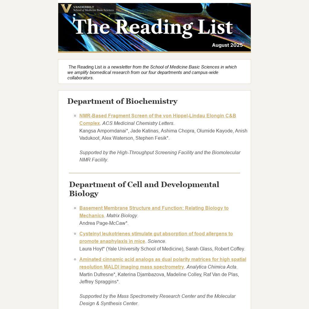 The Reading List is a newsletter from the School of Medicine Basic Sciences in which we amplify biomedical research from our four departments and campus-wide collaborators.