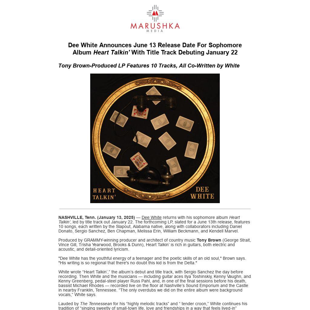 NASHVILLE, Tenn. (January 13, 2025) — Dee White returns with his sophomore album Heart Talkin’, led by title track out January 22. The forthcoming LP, slated for a June 13th release, features 10 songs, each written by the Slapout, Alabama native, along with collaborators including Daniel Donato, Sergio Sanchez, Ben Chapman, Melissa Erin, William Beckmann, and Kendell Marvel.