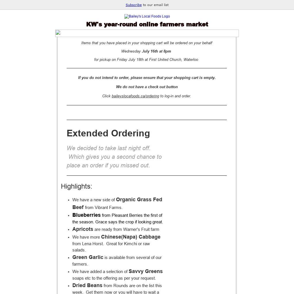 Stop in to our mid week market in downtown Kitchener every Tuesday!  Ordering is open Friday to Monday so you can pre-order Bulk Fruit at baileyslocafoods.ca/ordering