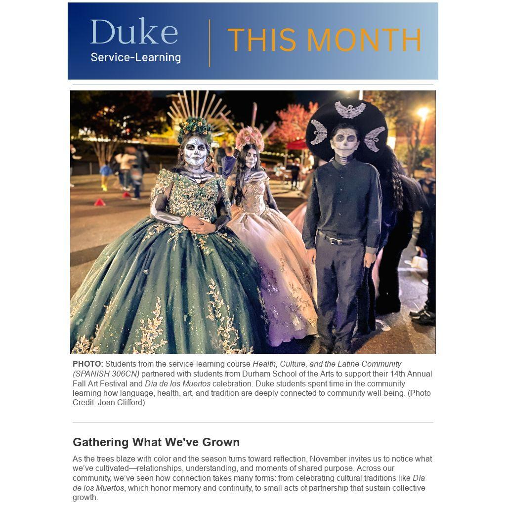 PHOTO: Students from the service-learning course Health, Culture, and the Latine Community (SPANISH 306CN) partnered with students from Durham School of the Arts to support their 14th Annual Fall Art Festival and DĂa de los Muertos celebration. Duke students spent time in the community learning how language, health, art, and tradition are deeply connected to community well-being. (Photo Credit: Joan Clifford)