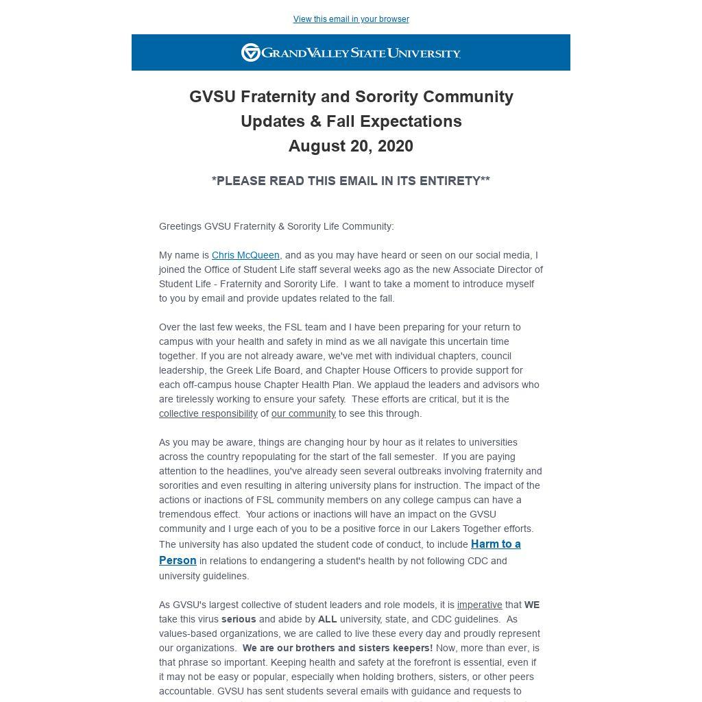 As you may be aware, things are changing hour by hour as it relates to universities across the country repopulating for the start of the fall semester.  If you are paying attention to the headlines, you've already seen several outbreaks involving fraternity and sororities and even resulting in altering university plans for instruction. The impact of the actions or inactions of FSL community members on any college campus can have a tremendous effect.  Your actions or inactions will have an impact on the GVSU community and I urge each of you to be a positive force in our Lakers Together efforts. The university has also updated the student code of conduct, to include Harm to a Person in relations to endangering a student's health by not following CDC and university guidelines.