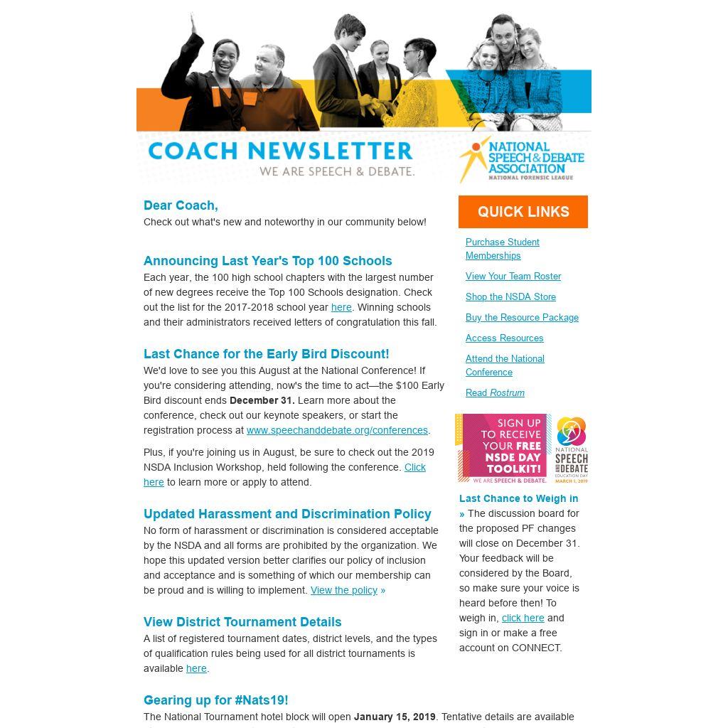 No form of harassment or discrimination is considered acceptable by the NSDA and all forms are prohibited by the organization. We hope this updated version better clarifies our policy of inclusion and acceptance and is something of which our membership can be proud and is willing to implement. View the policy»