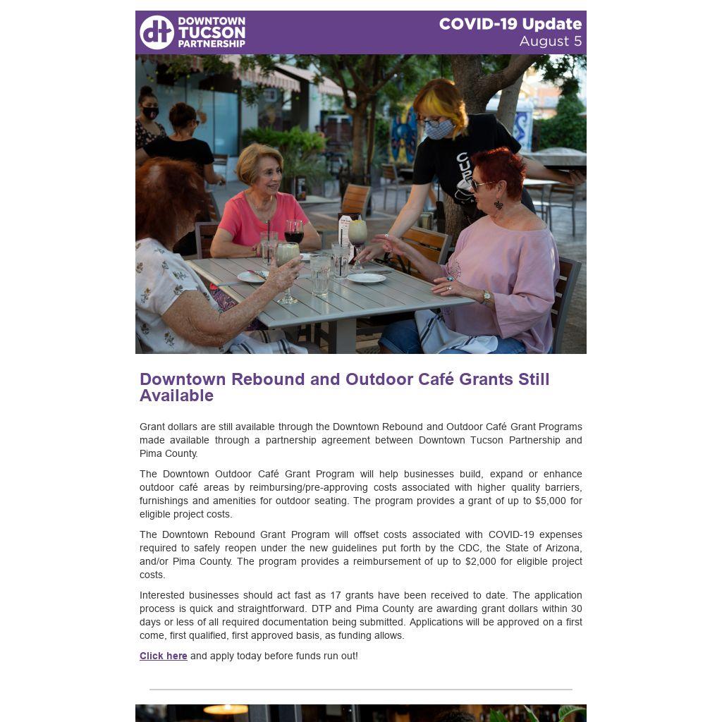 Grant dollars are still available through the Downtown Rebound and Outdoor Café Grant Programs made available through a partnership agreement between Downtown Tucson Partnership and Pima County.