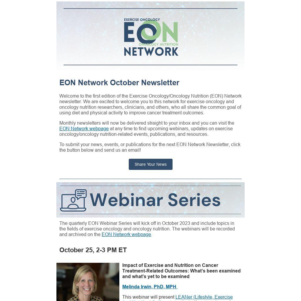 Monthly newsletters will now be delivered straight to your inbox and you can visit the EON Network webpage at any time to find upcoming webinars, updates on exercise oncology/oncology nutrition-related events, publications, and resources.