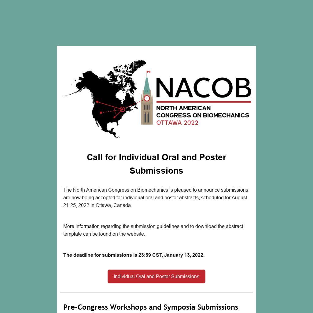 The North American Congress on Biomechanics is pleased to announce submissions are now being accepted for individual oral and poster abstracts, scheduled for August 21-25, 2022 in Ottawa, Canada.