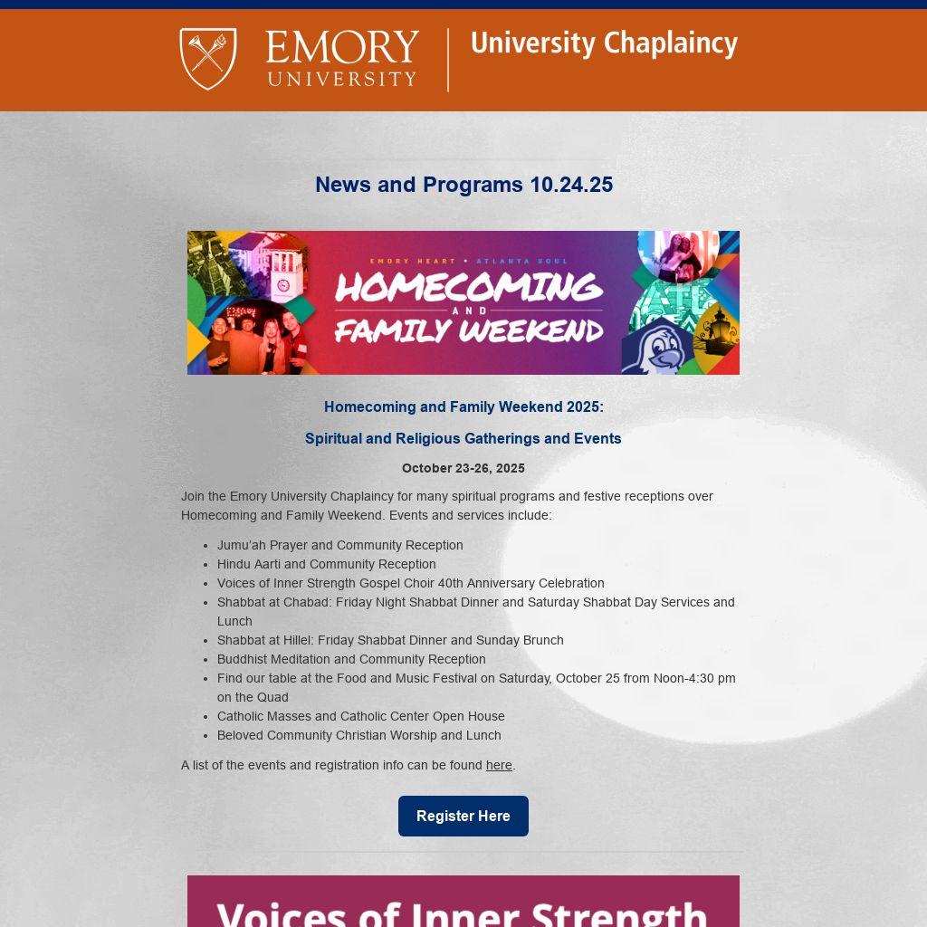Join the Emory University Chaplaincy for many spiritual programs and festive receptions over Homecoming and Family Weekend. Events and services include: