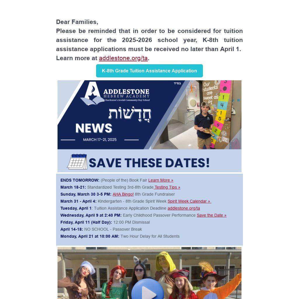 Save the Date for the Early Childhood Passover Performance on Wednesday, April 9, at 2:40 PM! Our Tiny Tots through EC4 students will bring the Passover story to life with songs and skits you won’t want to miss. If you have any questions, please contact play director, Miss Gerti. at gertrude.owensby@addlestone.org