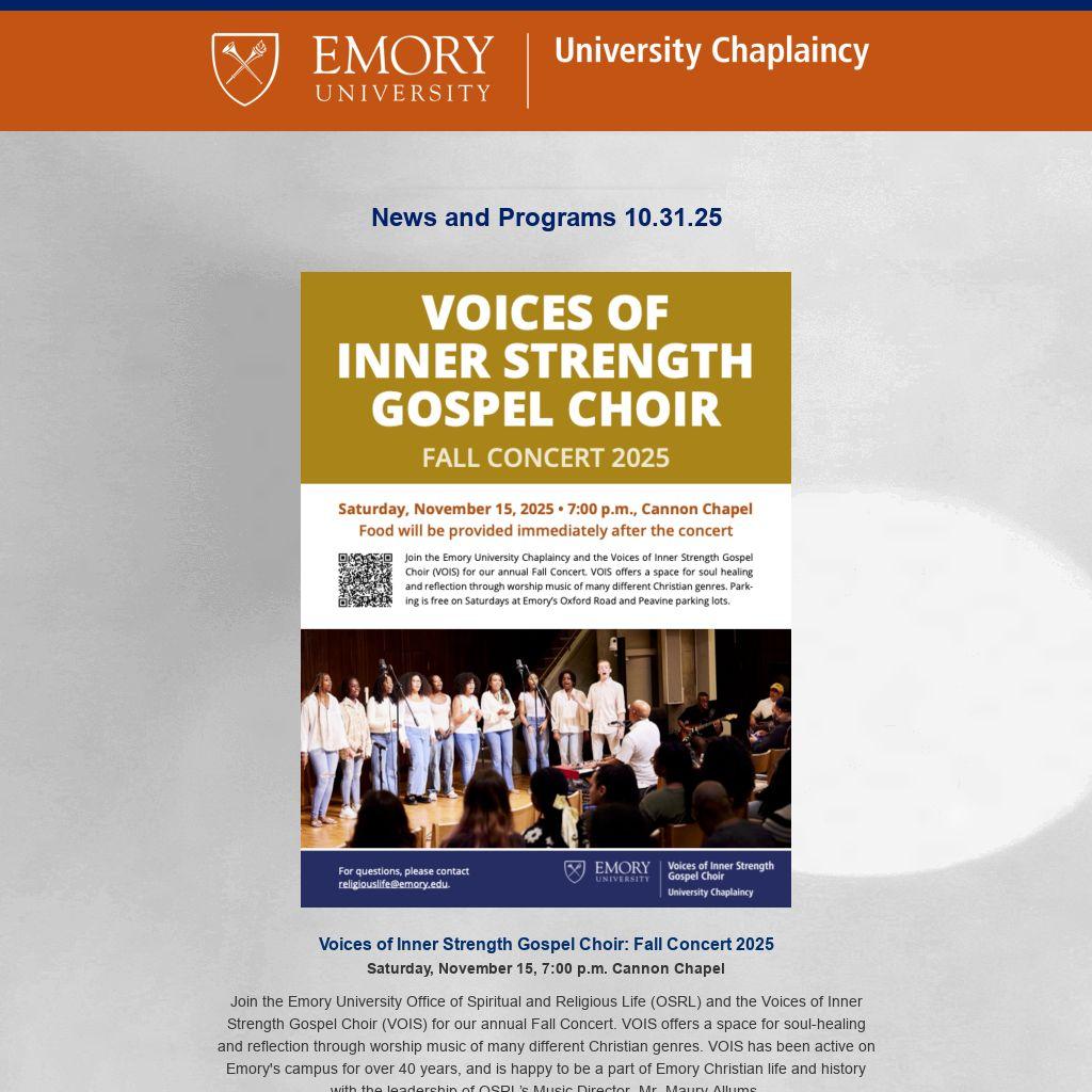 Join the Emory University Office of Spiritual and Religious Life (OSRL) and the Voices of Inner Strength Gospel Choir (VOIS) for our annual Fall Concert. VOIS offers a space for soul-healing and reflection through worship music of many different Christian genres. VOIS has been active on Emory's campus for over 40 years, and is happy to be a part of Emory Christian life and history with the leadership of OSRL’s Music Director, Mr. Maury Allums.