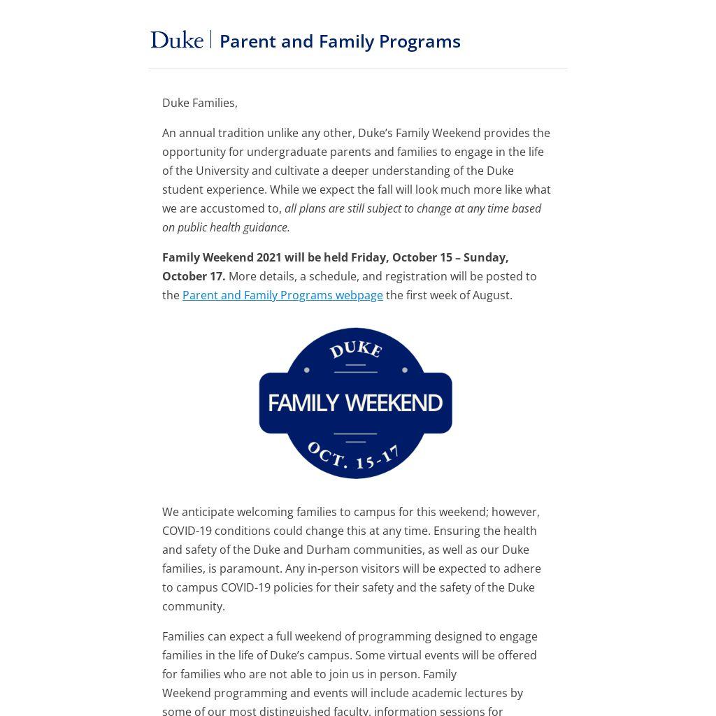 We anticipate welcoming families to campus for this weekend; however, COVID-19 conditions could change this at any time. Ensuring the health and safety of the Duke and Durham communities, as well as our Duke families, is paramount. Any in-person visitors will be expected to adhere to campus COVID-19 policies for their safety and the safety of the Duke community.