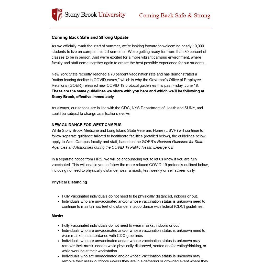 New York State recently reached a 70 percent vaccination rate and has demonstrated a “nation-leading decline in COVID cases,” which is why the Governor’s Office of Employee Relations (GOER) released new COVID-19 protocol guidelines this past Friday, June 18. These are the same guidelines we share with you here and which we’ll be following at Stony Brook, effective immediately.