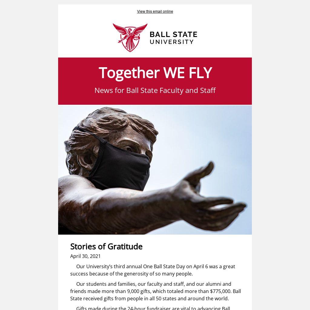 I am grateful to employees at the Ball State University Foundation, to employees across the University who served on various planning committees, and to our One Ball State Day ambassadors who promoted our efforts through emails and social media.