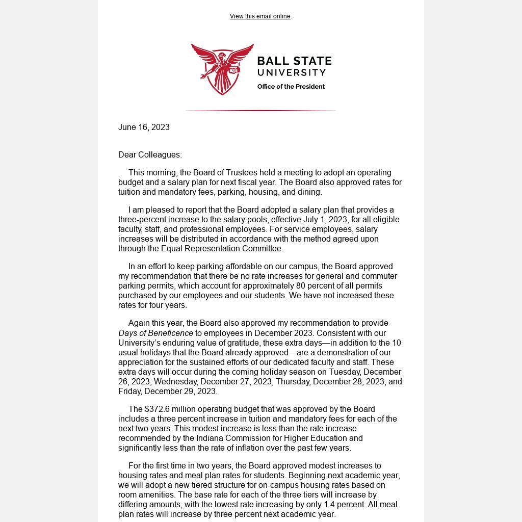 I am pleased to report that the Board adopted a salary plan that provides a three-percent increase to the salary pools, effective July 1, 2023, for all eligible faculty, staff, and professional employees. For service employees, salary increases will be distributed in accordance with the method agreed upon through the Equal Representation Committee.